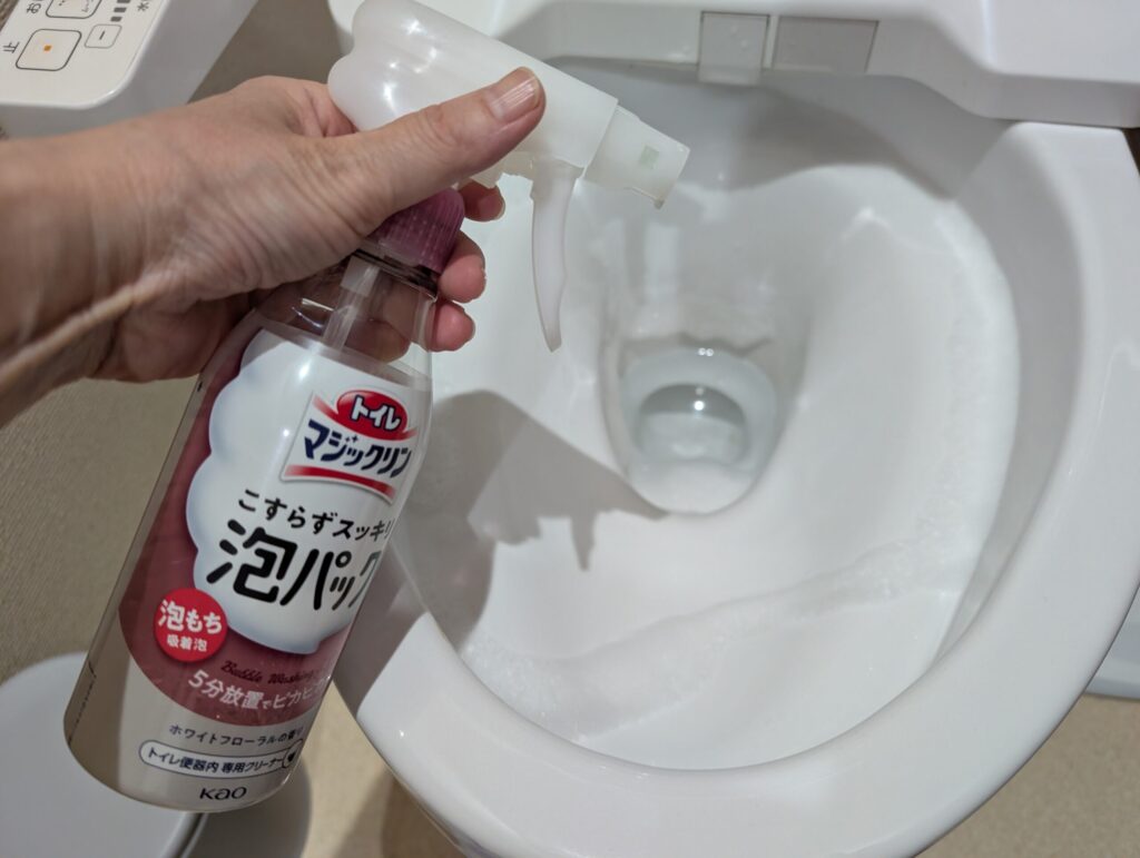 まず初めに便座をあげ、[トイレマジックリン 泡パック]を吹きかけて、