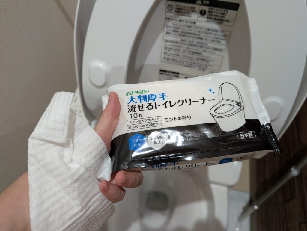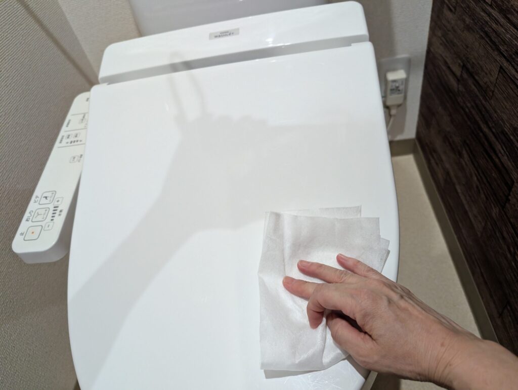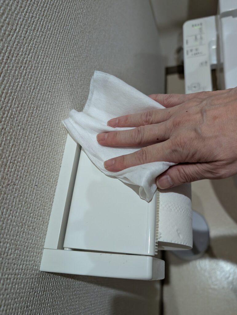 そして使い終わったシートの裏側で、トイレットペーパーホルダ―の上とか棚の上とかの誇りを拭き取ります。