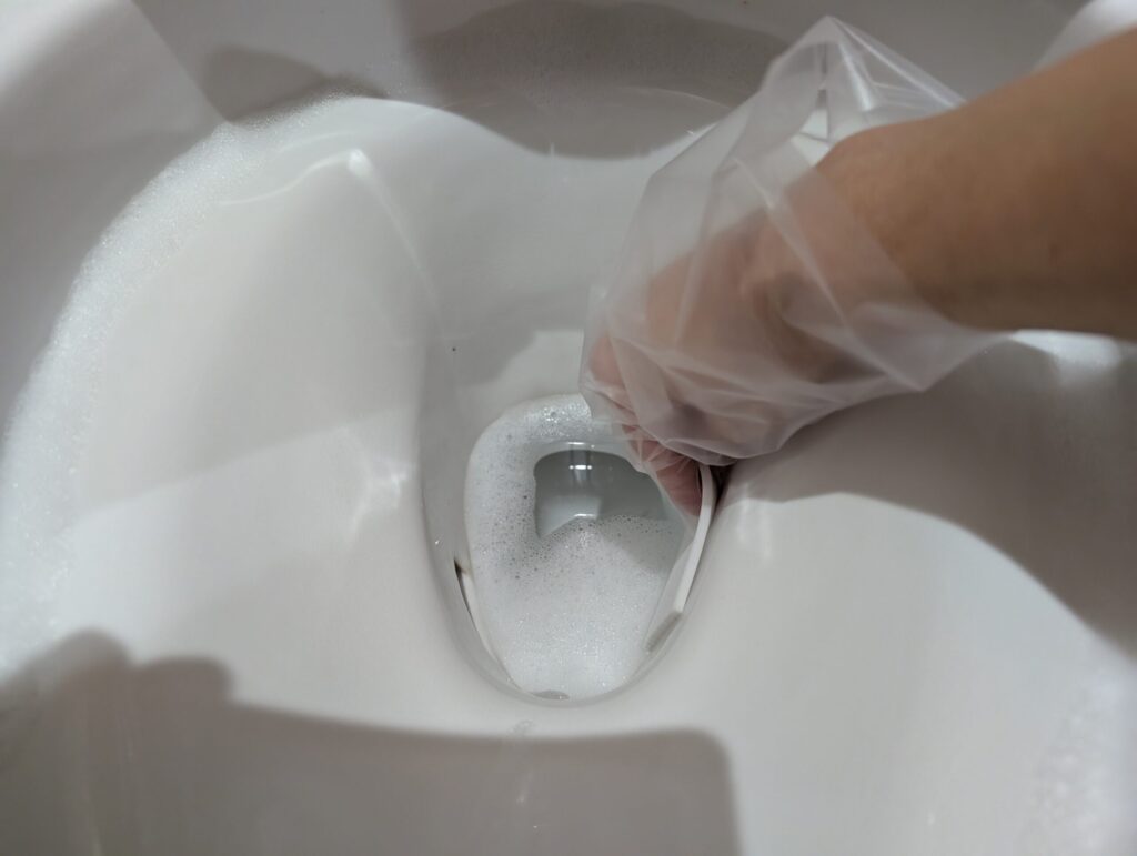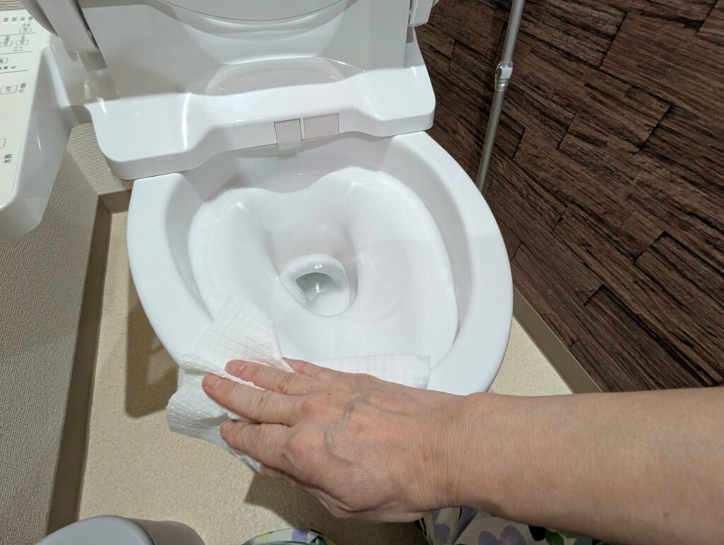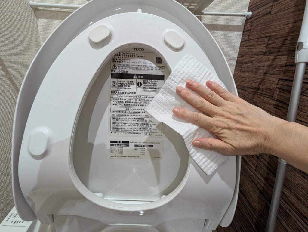 ふたのうら、便器の淵などを[スギ薬局流せるトイレクリーナー]で拭きます。