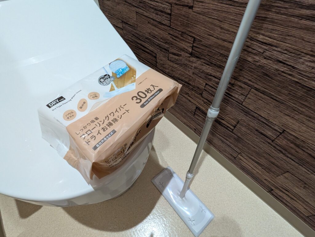 で、いったんふたを閉めて今度は床掃除。これはセリアの[フローリングワイパードライお掃除シート]。いろいろ使いましたが、これが一番丈夫で使いやすかったです。
