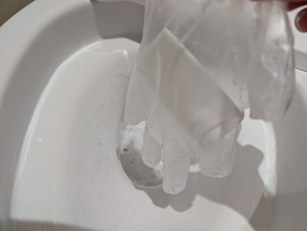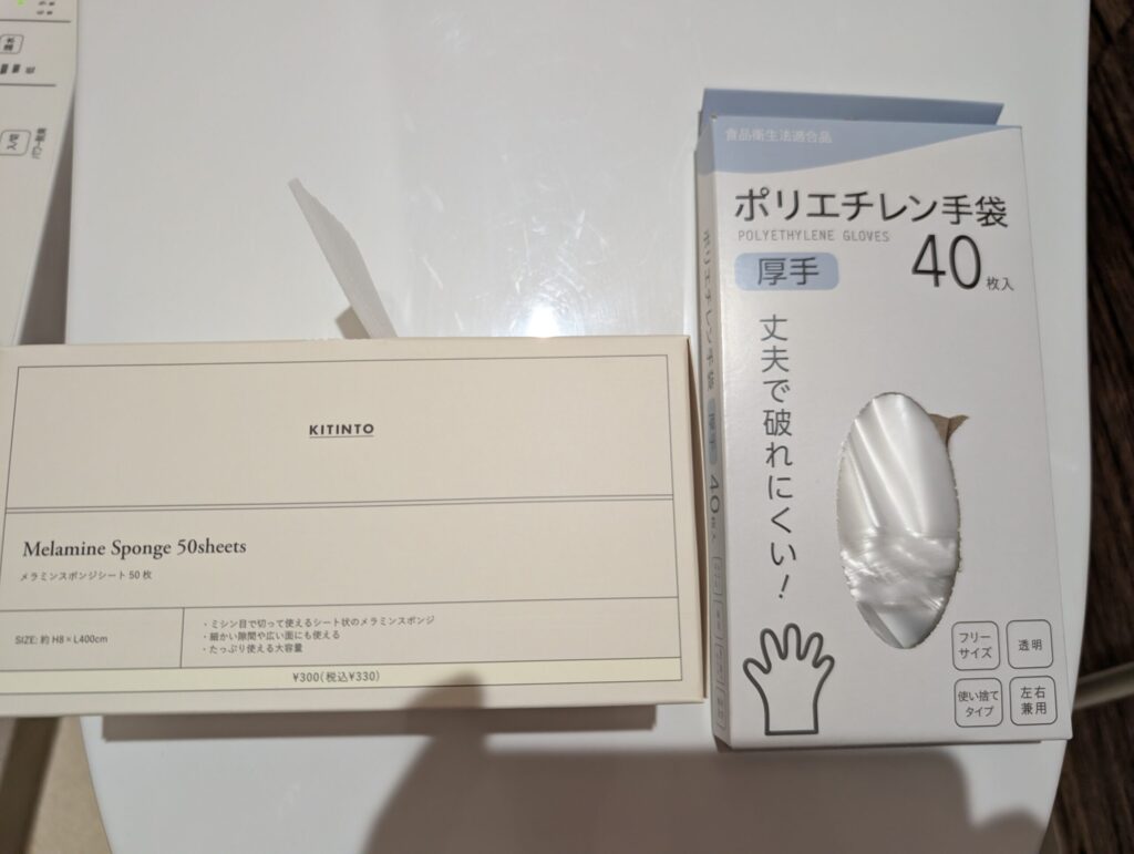 このちょっと丈夫なナイロン手袋をして、スリコのキッチン用はがせるメラミンスポンジで