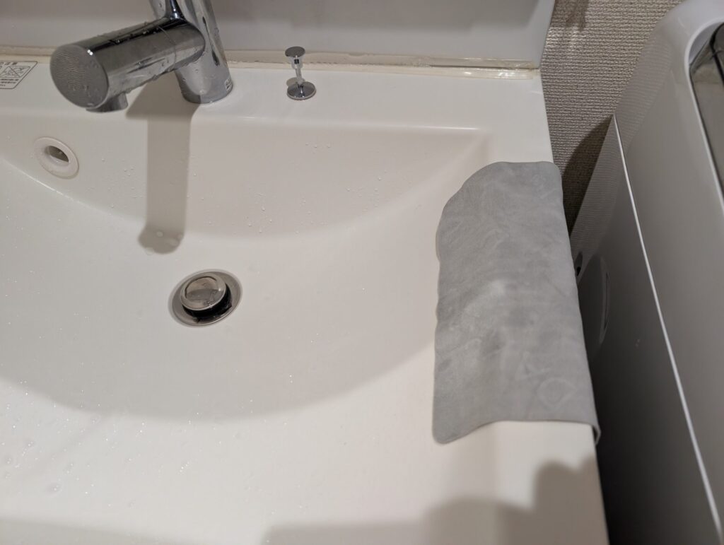 洗面所のふちにかけておけば、ぬれたらその度に拭き取れます。