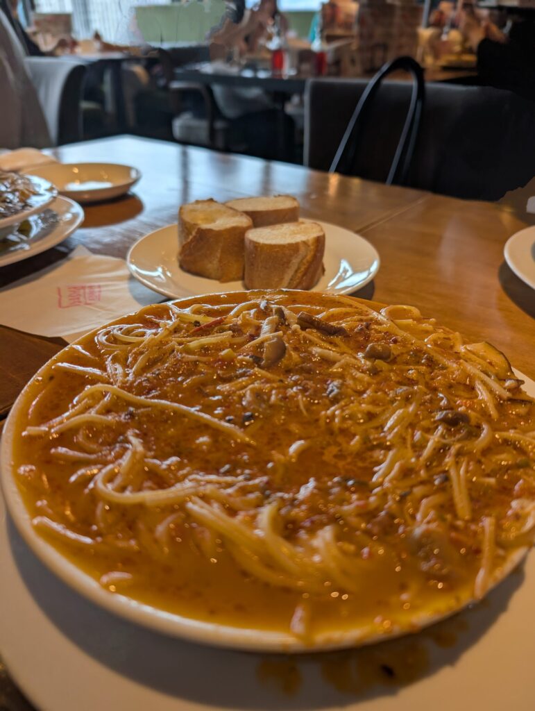 テーブルには唐辛子オイルが置いてあって、私は途中で辛みを少し足しました。